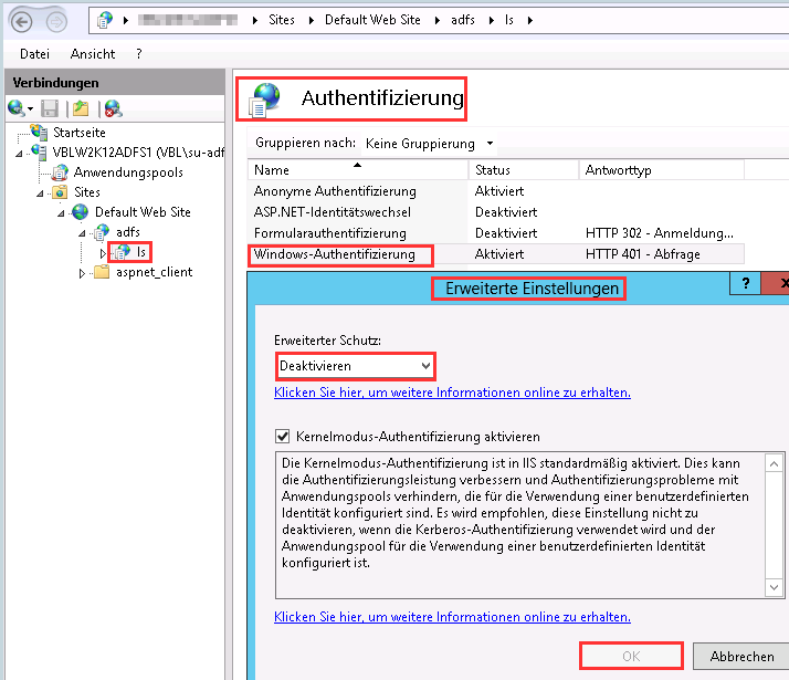 To turn Extended Protection off, on the AD FS server, launch IIS Manager, then, on the left side tree view, access Sites -> Default Web Site -> adfs -> ls. Once you’ve selected the “/adfs/ls” folder, double-click the Authentication icon, then right-click Windows Authentication and select Advanced Settings… On the Advanced Settings dialog, choose Off for Extended Protection.[/caption]