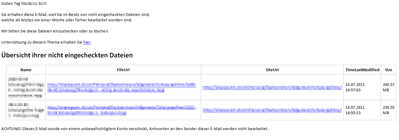 To handle this issue I’ve written this simple script that reports all unchecked files of a SharePoint installation, writes and sends a nice report by mail to the owner of those files.
