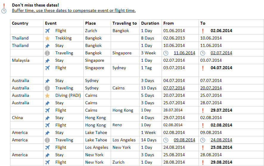 In OneNote I’ve made a timeline with the most important events, stops and flights: