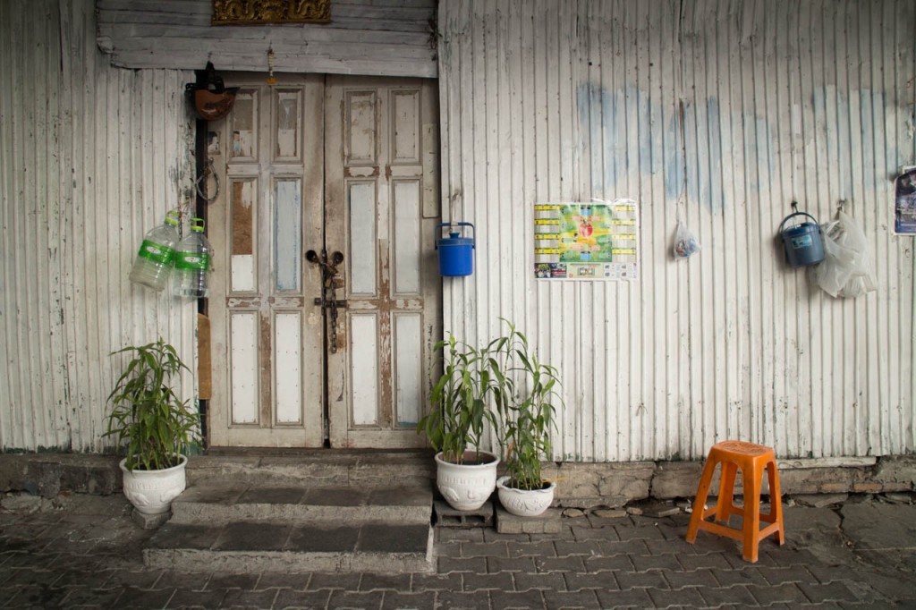 The typical thai door. A helmet for the scooter. Drinking waater from the store. Religious tag to please the spirits. Some herbs for nice meal. A chair to relax.